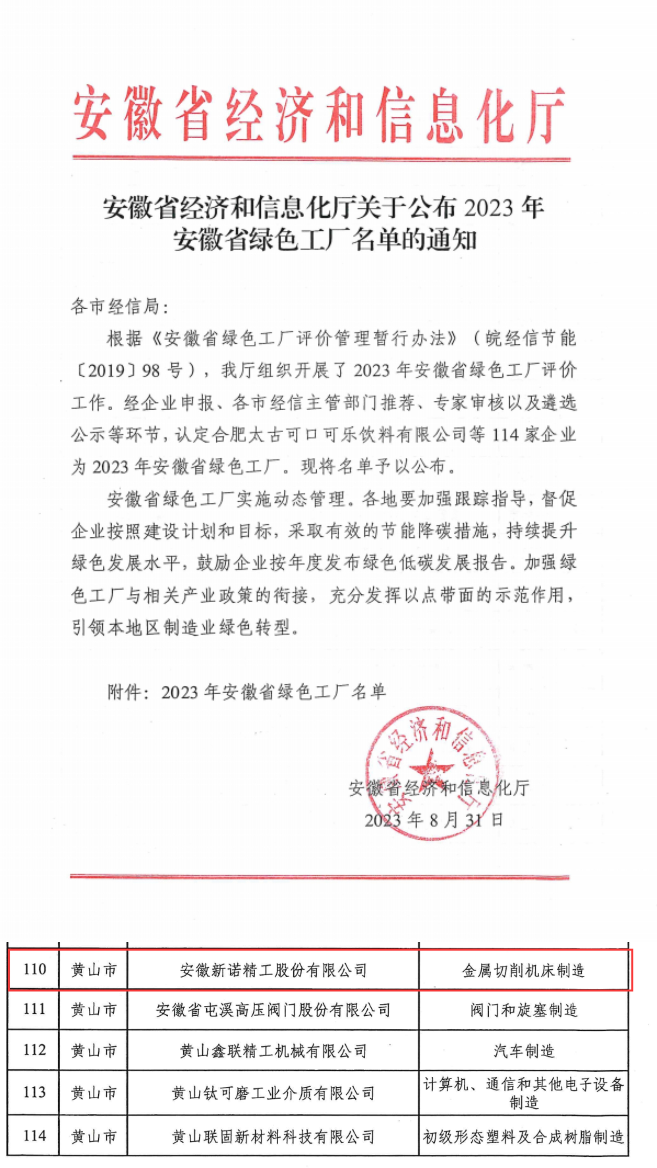 根據(jù)《安徽省綠色工廠評(píng)價(jià)管理暫行辦法》(皖經(jīng)信節(jié)能〔2019〕98號(hào))、《安徽省經(jīng)濟(jì)和信息化廳關(guān)于做好2023年省級(jí)綠色工廠推薦和復(fù)審工作的通知》有關(guān)要求,經(jīng)公司申報(bào)、黃山市經(jīng)濟(jì)和信息化主管部門審核推薦、省廳初審、專家評(píng)審、公示等程序,安徽新諾精工股份有限公司被評(píng)為2023年安徽省綠色工廠。